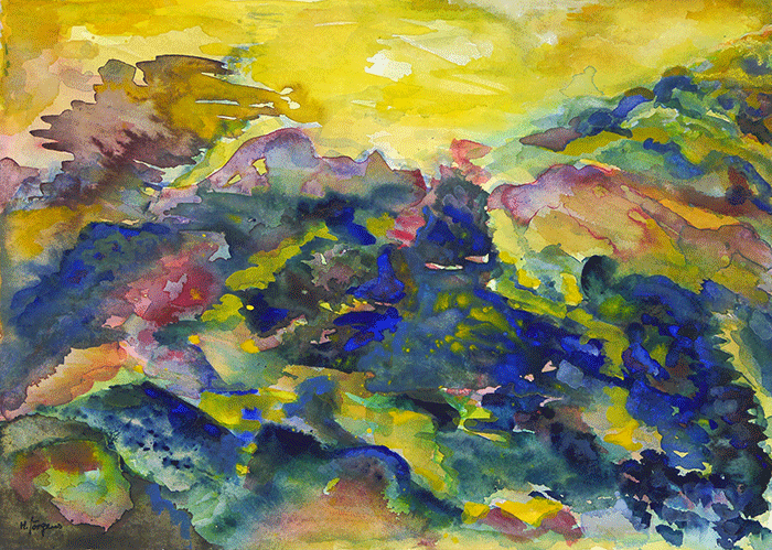 MOUNTAIN LANDSCAPE, 2020, Watercolour and water-soluble colour crayon on paper 298 x 419 mm, Private collection © Helga Joergens back next